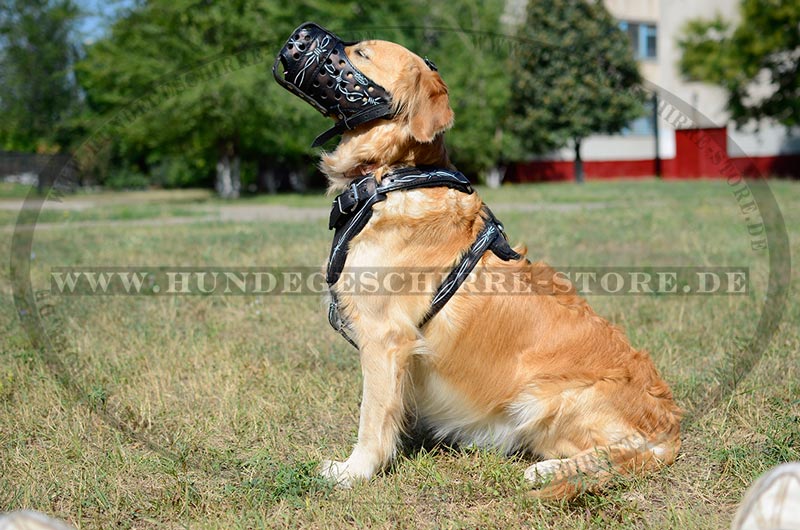 Golden Retriever mit abriebfestem Leder Hundegeschirr und Beißkorb