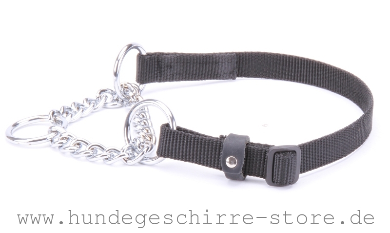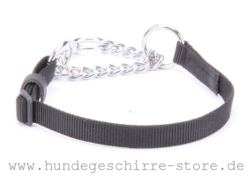 Die Qualität und Design von diesem Hundehalsband aus Nylon-Schlaufe und chromierter Stahl-Kette werden Sie bestimmt schätzen! Es ist sehr praktisch, stark und multifunktionell. Das Modell ist mit zwei Ringen für Größe-Regulierung und einem Ring für Hundeleine-Befestigung ergänzt. Es passt perfekt für Sport, Dienstarbeit, Spaziergänge und Dressur. Ihr Haustier wird sich damit bequem fühlen!