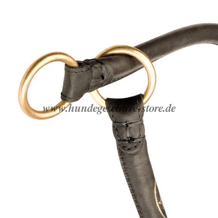 Verlässliches Zughalsband für Dressur und Erziehung aus weichem Leder für Risenschnauzer. Dieses Zughalsband besteht aus einem Nylon-Seil, mit Mantelfäden zusammengenähtem, abgerundetem Ledergurt und 2 großen O-Ringen aus rostfreiem Messing. Die Breite des Zughalsbandes beträgt 6 mm. Abgerundetes Zughalsband aus Leder ist schonend für Hundefell und verhindert die Entwicklung von allergischen Reaktionen. Dank diesem strapazierfähigen Leder Hundehalsband für Riesenshcnauzer werden Sie den Hund erfolgreich und effektiv kontrollieren und ihn erziehen. Echte Handarbeit, perfekte Qualität, Elastizität und bequemes Design machen das Riesenschnauzer Erziehungshalsband zu einem dauerhaften und abriebfesten Hundezubehör für Alltag, Hundetraining und Hundesport.